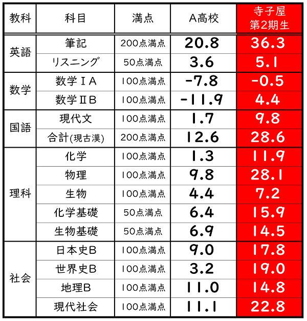 例えば、英語の筆記は20.8とありますが、校内平均が20.8点上がったことを意味します。