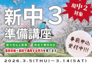 まず最初に、スクール寺子屋が中学3年生にどのような方針で指導しているかをご紹介させてください。 その上で、ページ下部に『新中3準備講座』の詳細を掲載していますので、ぜひご覧ください。 中学3年生= … 続きを読む 新中3準備講座