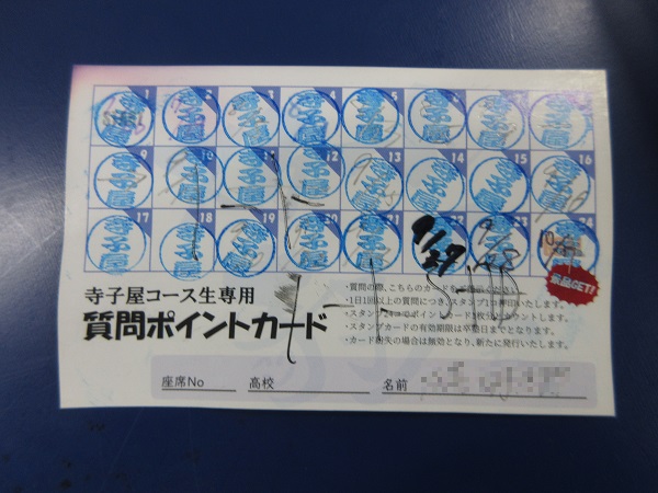 寺子屋コースでは 質問ポイントカードなるものが あります。 寺子屋コースでは 自立学習の時間がたっぷりととれます。 しかも、指導時間中は 非常勤スタッフがいますので 質問もし放題です。 …